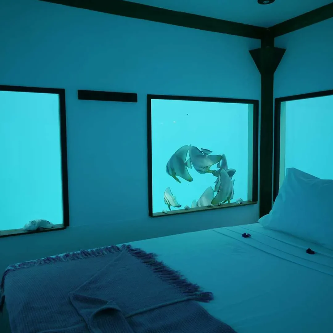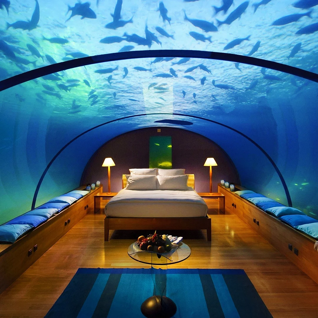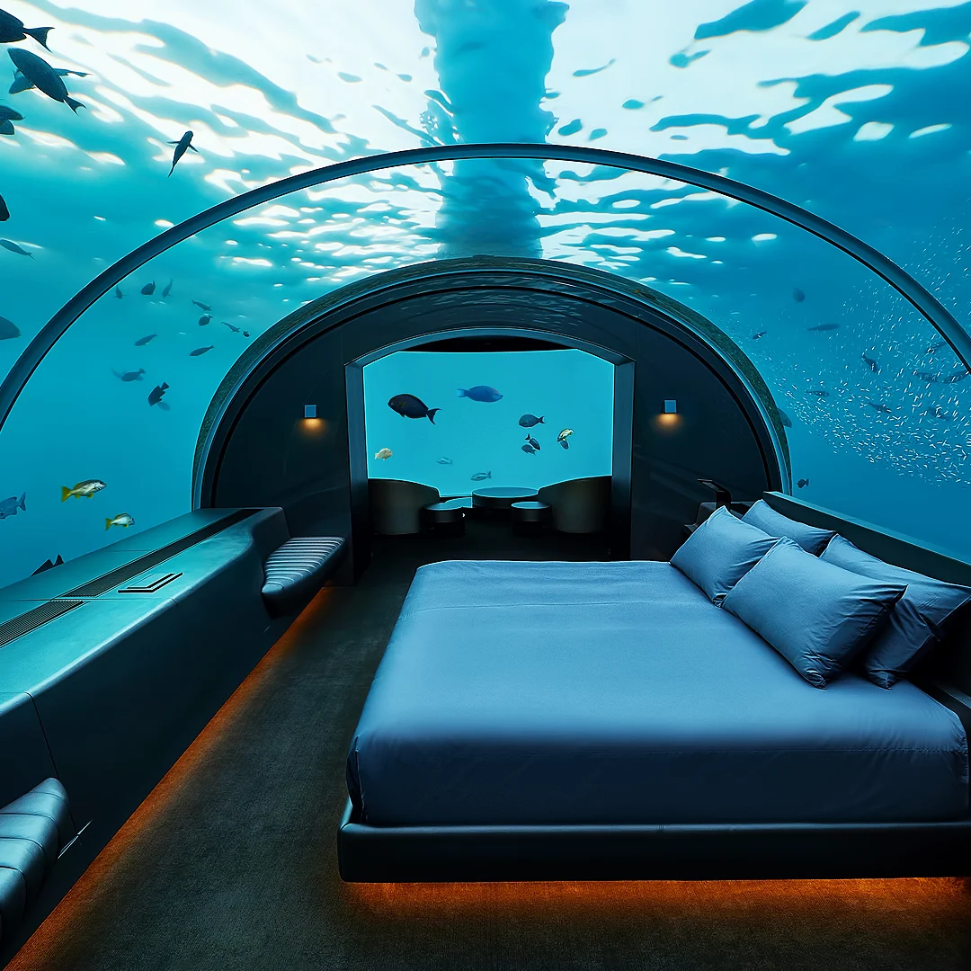 Maldivler’de bulunan bu lüks otel, dünyanın ilk denizaltı otel odasına sahip. Conrad Maldives Rangali Island’daki Muraka süiti, Hint Okyanusu’nun altında yer alıyor ve konuklarına su altı yaşamını yakından izleme fırsatı sunuyor.