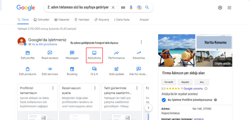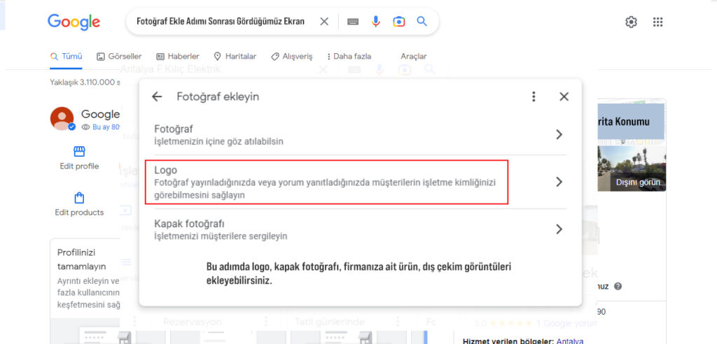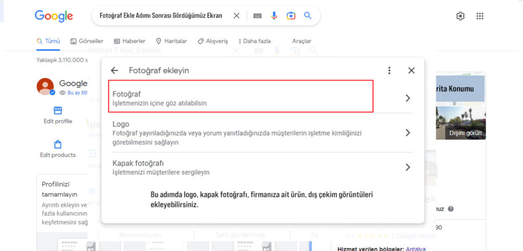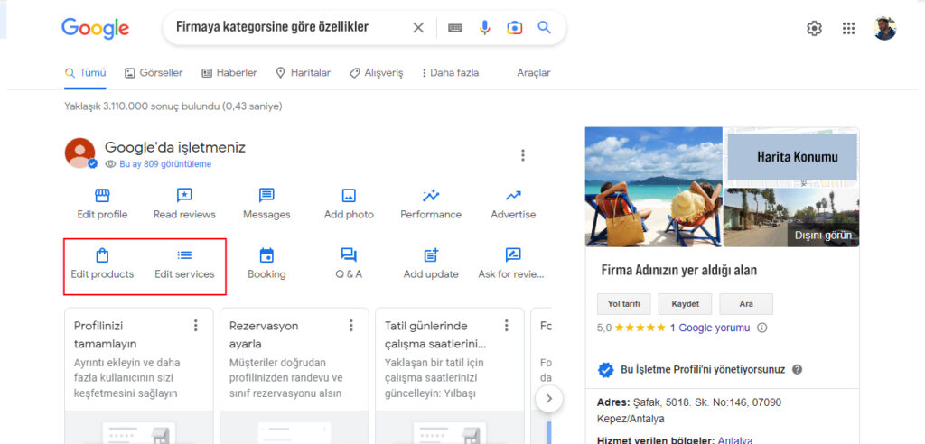 Google işletmenin kategorisine göre görsel üzerinde yer alan kırmızı ile belirttiğimiz şeçenekler kategorilere göre değişkenlik göstermektedir. Ürünleri ve Hizmetleri sektörünüze göre güncelleyebilrisiniz.