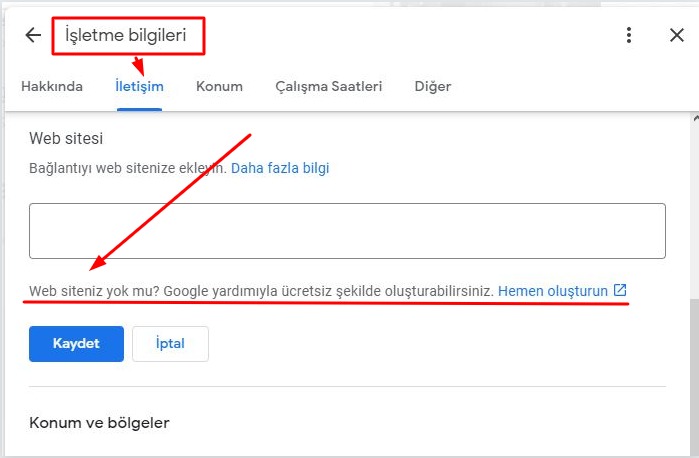 - Adım: Aşağıda şu yazıyı göreceksiniz “Web siteniz yok mu? Google yardımıyla ücretsiz şekilde hemen oluşturabilrisiniz” tıklayın ve sitenizi oluşturun.
