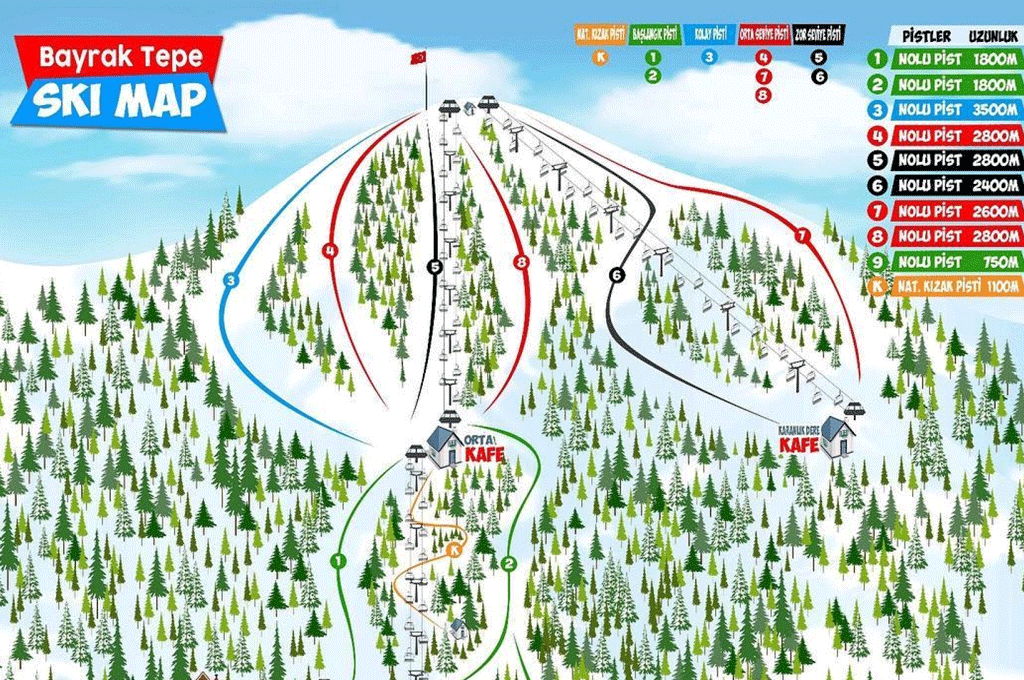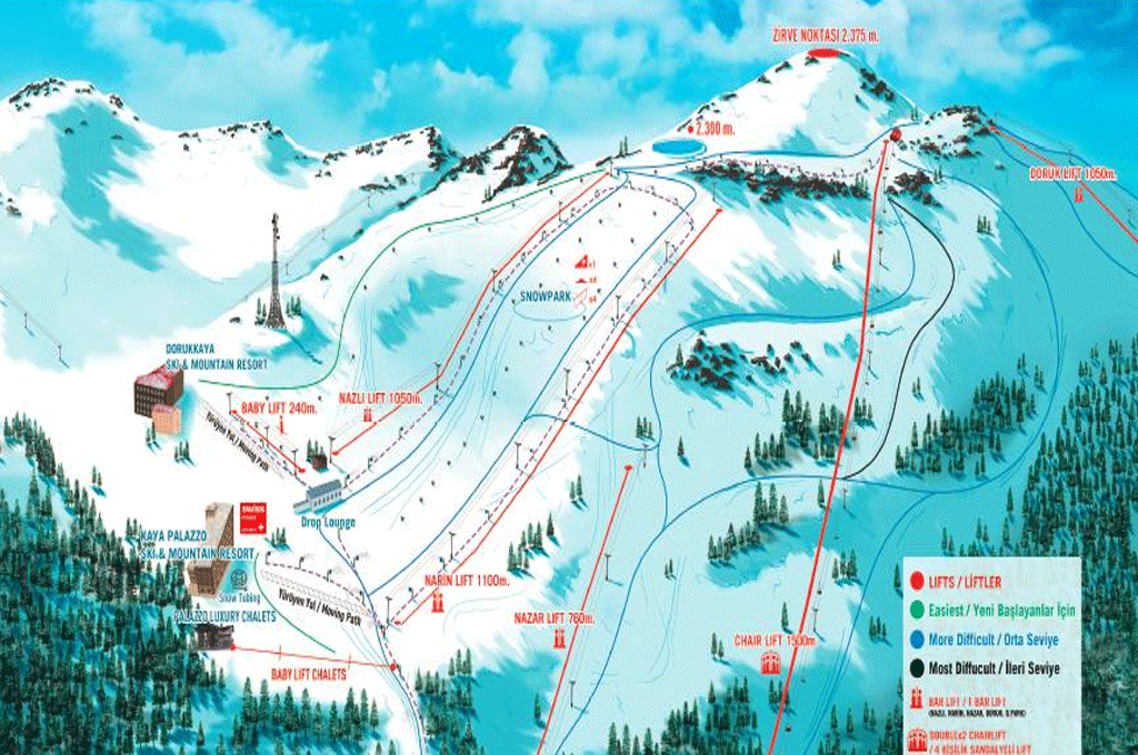 Sezon boyunca yüksek kar kalitesi, farklı zorluk derecelerinde ve uzunluklarında konumlandırılmış 7 adet Ski-Lift; 2 adet 240 m Babylift, 1 adet 750 m, 1 adet 1080 m , 1 adet 1100 m, 1 adet 1300 m, 1 adet 900 m ve 11 adet kayak pisti, Türkiye’nin en iyi kayak ve snowboard okulları, profesyonel eğitmenler , Türkiye’de ilk olan Snowpark ile kayak sporuna ve eğlenceyi zirvede yaşayacaksınız.